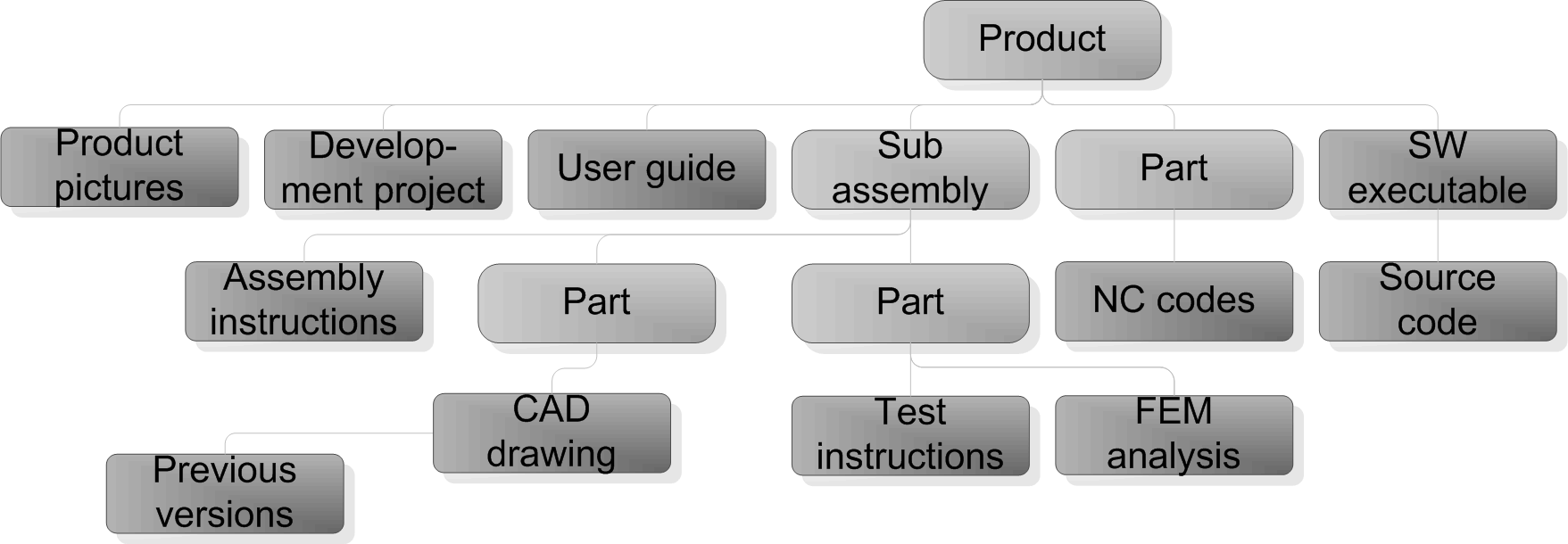 Figure 5: Product structure with links. Here seen with origin in a part of a traditional BOM (light grey boxes) with links to related documents. Based on a figure from [CIMdata et al., 2005].The documents in the PLM system are structured and managed by links as shown in fig. 5. Relevant documents are linked to e.g. the products or parts. It is not only parts and sub assemblies which are linked to the product. Also the different versions, requirements and other relevant information are linked to the parts and so on. This means that the employees do not need to know which drive or database the documents are saved in. The linking of documents in a structure eases the search for information across functions in the enterprise. And information of where the part, test etc. is used is easily located, thereby making it easier to assess the effects of changes in e.g. a part of a product. As different user groups can see the product differently, PLM supports different views of product structures. E.g. EBOM and MBOM, which as mentioned earlier, are different documents from the same product structure but used in different contexts. Workflow management